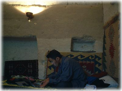 ![]() こちらは私たちが泊まった部屋。なんと奇岩の中の洞窟部屋です。初めての洞窟部屋を記録しようと必死でパソコンをいじるダンナ、写真を撮る妻(笑)。部屋は暑い昼間には涼しいが、朝夕はかなり寒い。ちなみにこの部屋で1泊2000円ちょっと。お得です |