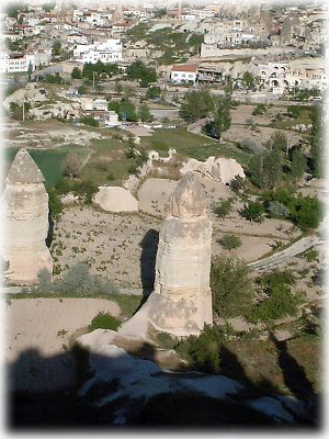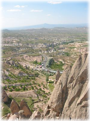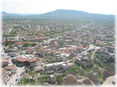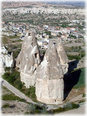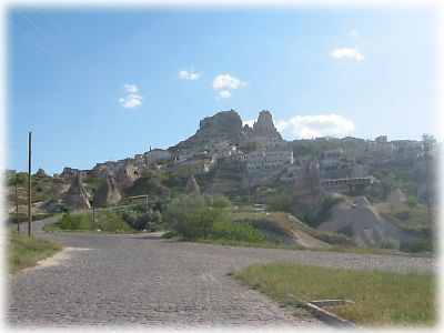 ![]() ギョレメの近くのウチュヒサールという村は大きな岩で造られた城塞が中心にあり、その周囲を囲むように村ができている。遠くから見るとにょきっと突き出した岩山がすぐ目に入る |