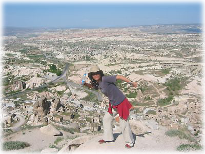 ![]() 岩山のてっぺんから見渡すカッパドキア・パノラマ。スゴ過ぎて、このまま空に向かって駆け出してしまいそうだ(笑)。乾いた土地ににょきにょきと岩が生え、その合間を縫って緑が顔を出している |