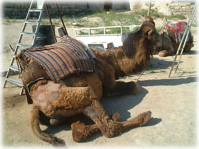 ![]() ラクダくんは疲れてしまったのか、お姉さん座りになって、一休み。この足のポース、なんかキュートでない? 後方に見える脚立はラクダくんに乗るためのもの |