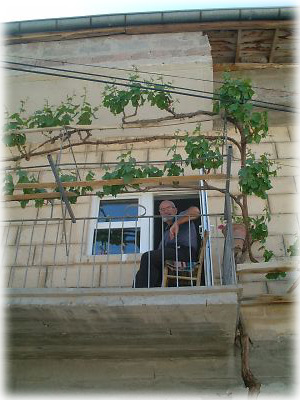 村の家のテラスから、トルコ人のおじちゃんがこちらを見つめていました。不審者に見えたのかしら(笑)。テラスを囲んでいるのはブドウ。ここでは鳩の糞を肥料にしてブドウを育てているとか |