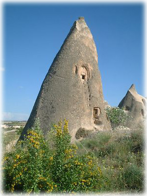 上のほうで岩窟教会や宿は紹介しましたが、スゴイのはいまでも奇岩の中の洞窟に人が住んでいるということ。このトンガリ岩も、あるファミリーのおうち。人生で一度ぐらいこんな家に住んでみたいものです |