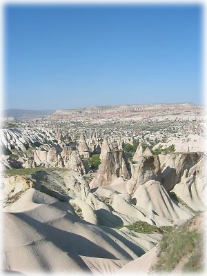 ![]() カッパドキアは関東平野ほどの広大な地域。その中のギョレメというエリアを中心に、写真のような奇岩が広がっている。まるで映画のような光景にしばし見入る。これがすべて自然の力で作られたのだから、スゴイ |