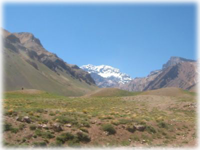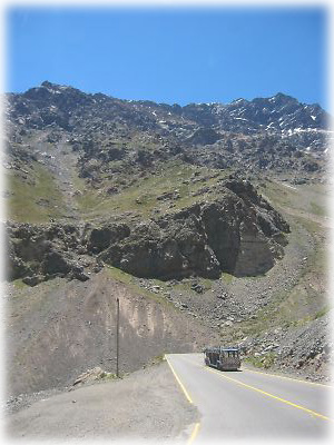 ![]() チリからアルゼンチンへ抜ける道は、アンデス山脈を突っ切って走るだけあって、相当な絶景が続く。前方に南米最高峰のアコンカグアが白い頭をチロリと覗かせている |