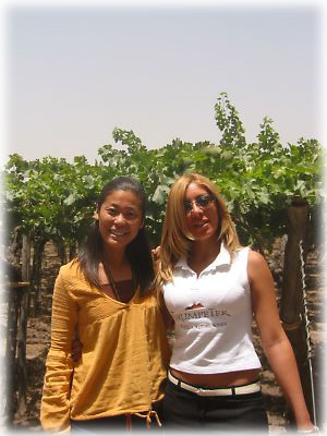 メンドーサのワイナリー見学では、超美人のガイドお姉さんが園内をご案内してくれました。後ろの緑の木がワインの原料となるぶどう。ここメンドーサではアルゼンチンワインの8割を作っているとか |