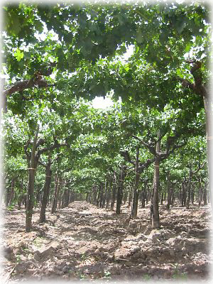 等間隔で植えられたぶどうの木には、緑の小さなつぶがなっていた。秋の収穫の時期にいっせいに刈り入れるのだそう |