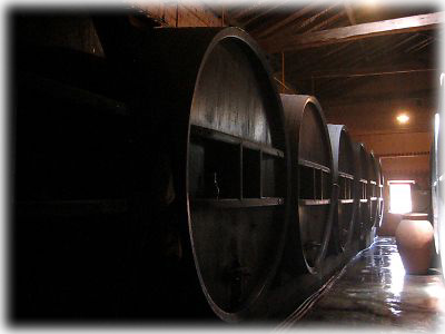 ![]() 工場ではこんなジャンボな樽でもって発酵させている。こちらは1トン樽で、さらに大きなものもある。いったいボトルにしたら何本分? |
