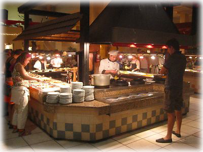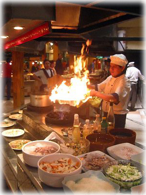 中国人経営の店だけあって、ホットディッシュは目の前で調理してくれる。ガンガン火を出すのも中華流? これだけのサービスで食べ放題でひとり12ペソ(=約450円)は安い! |