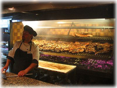 ![]() ブッフェには、アルゼンチン名物のアサード(肉のステーキ)も含まれている。巨大な肉が炭火に並べてあって、それだけで迫力満点 |