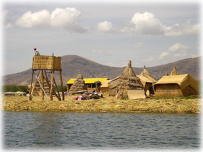 ![]() チチカカ湖観光はツアーに参加するのが一般的かつ楽チンな方法。まず最初に行ったのが「トトラ」という植物で作られた浮島のウロス島。遠目で見ても、茶色い島が浮いている様子はなんだか不思議 |
