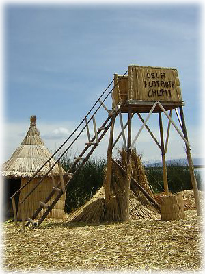 ウロス島はとにかくすべてのものが藁のような植物「トトラ」でできている。島もトトラなら家もトトラ、見晴台もトトラ。生活の知恵なのか、はたまた不精なのか…… |