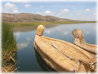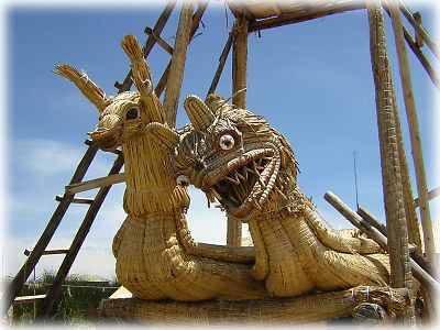 ![]() トトラでできた船。見ていると「大丈夫?」と思ってしまうけれど、触ってみると結構ガッチリしてて水漏れの心配なし。この船は実際に観光用、移動用としていまでも使われている |