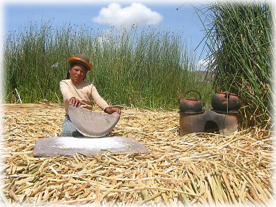 ![]() 石と石を合わせてゴリゴリこすり、穀物を粉にしていた少女。写真を撮ったらしっかり「お金ちょうだい!」と言われてしまった……。少女の奥に写っている緑の植物が「トトラ」。これを乾燥させると、藁のようになる |