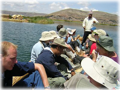 で、ウロス島に上陸。ここの島は藁を敷き詰めたような感触があって、ついゴロリと寝そべりたくなる(笑)。写真右が、なんとこのツアーで偶然に再会した石塚さん。以前出会ったのはアフリカはケニアで、実に7か月ぶりの再会なのです |