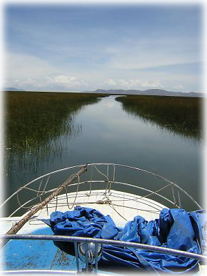 ボートに乗り換えて、次なる目的地アマンタニ島を目指す。次の島まで4時間弱と、結構な距離がある。トトラの茂る湖を分け入るように進んでいくボート |