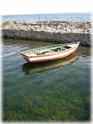 アマンタニ島の船着場に到着。思ったよりも湖の水はきれいで、水面下の水草が透けて見える。島人が使っているのはこんな小さな手漕ぎボート |
