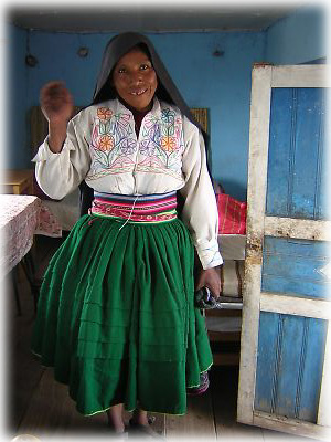 で、こちらが私たちを迎えてくれたお母さん。素朴ないい人で、カメラを向けるとぎこちなく手を振ってくれました。この島の衣装は細かい刺繍のブラウスと、ふわりと広がったスカートでちょっとメルヘンちっく |