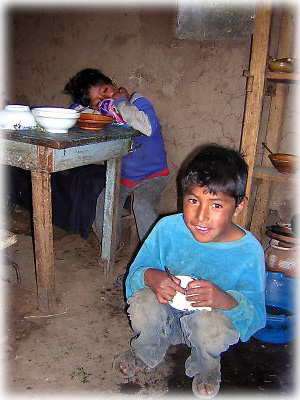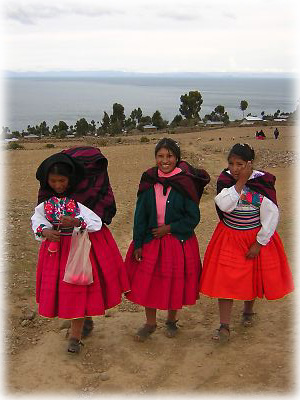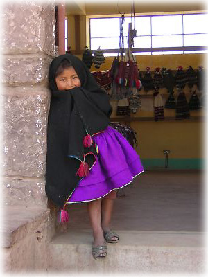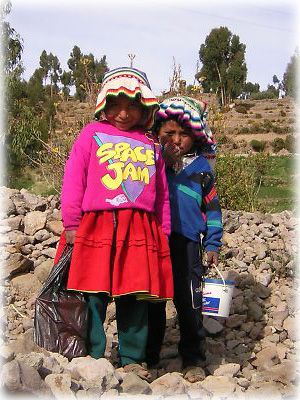村の子供たち。女の子は民族衣装のスカートに、いまどきのトレーナーを着ているのがやけくそ気味でカワイイ(笑)。カラフルな帽子はもちろん手編み。このあたりの人は編み物が上手なのね |
