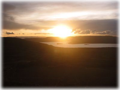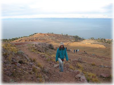 ![]() 島の中央部は小高い丘になっている。その頂上までちょっくら散歩。といってもこの湖があるところが標高4000メートル近くだから、ちょっと登るだけで息が切れる |