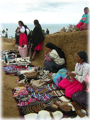 村の女性たちは観光客が行く先々にかまえて、お土産物を並べて待機している。メインは手作りの編み物。みんな結構な勢いで買っていたから、いい商売なのかな? |