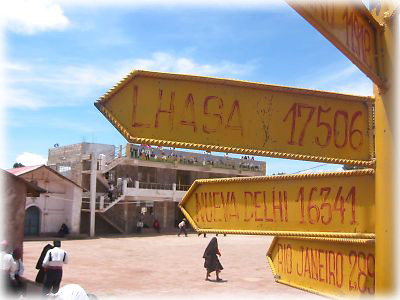 ![]() 島の広場には、この地点から世界各地への距離を表す看板が立っていました。チベットの首都ラサへは1万7千キロ以上。はるか離れたこのふたつの地ですが、それでも彼らの顔体、そして民族衣装の色使いなどかなりの共通項があるのに驚かされます |