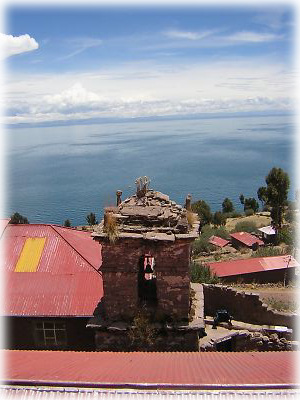 ![]() 翌朝は快晴。最後の島、タキーレ島に移動しての観光です。段々畑が広がるこの島は、湖からかなり盛り上がった造りをしていて、いたるところから湖が目に入る |
