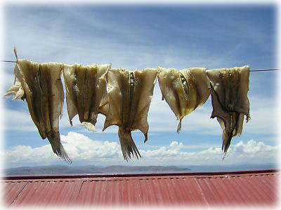 ![]() 日干しになっているのは、チチカカ湖で捕れるぺヘレイという魚。青い空にむかってデレーンと干されているさまは、なんだか気持ちよさそう? |