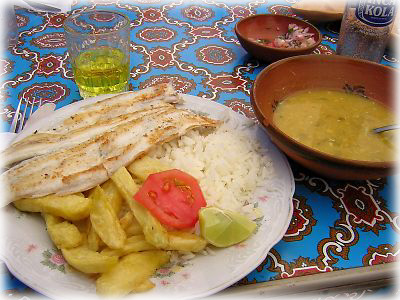 ![]() 島でのランチタイム。メイン・ディッシュはもちろんお魚。シンプルな料理だけど、湖から吹く心地よい風を受けながらのランチは実に美味でありました |