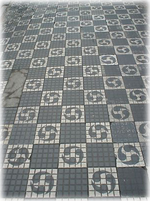 商店街の歩道は、すべてこんな雷マークのタイルになっている。逆にいまの日本人なら、このセンスはないのかもしれないな…… |