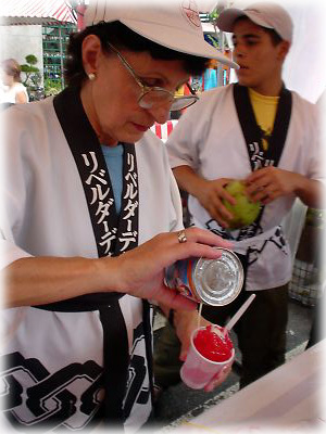 こちらはカキ氷コーナー。シロップをこれでもかとかけるのはブラジル流ですが、ハッピはもちろん日本風 |
