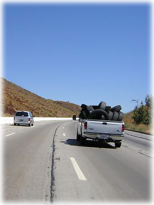 ラスベガスに向かう道も色々と景色にドラマがある。そんなにタイヤ積んで大丈夫? な車を見たりすることも。走っているとタイヤ&タイヤのカスが落ちていることも多い |