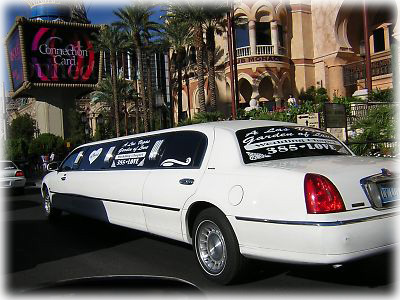 ![]() いよいよラスベガスの街に入った……と思ったら、いきなり白い、長〜い車。このリムジンって、アメリカっぽいよなー。ベガスではこのスーパー・デラックス車もよく走っている。ちなみに写真の車は結婚式用に使われているもの。ベガスは結婚式のメッカとしても知られているのだ |