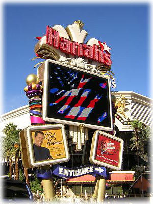 これまでリノ、レイクタホで見かけておなじみだったホテル、「ハラーズ」をさっそく発見。さすがベガスでは、装飾も派手。私たちはこういうネオンサインに弱い |