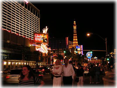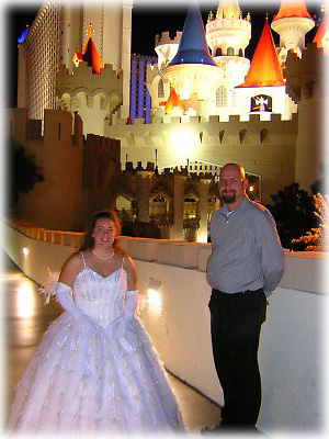 ラスベガスはイージー&クイック結婚式のメッカ。エクスカリバーの前ではいましがた式を挙げたばかりの花嫁さん花婿さんが。お幸せに……。でも、微妙にふたりの間が空いてるのはナゼ? |
