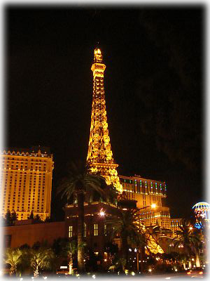 ![]() 夜のとばりが降りてくると、ラスベガスが色っぽくライトアップされていきます……。ネオン好きの私たちとしてはワクワクするぞ(にやり)。昼と夜の顔がこれだけ違うってのも、街歩きをしていて楽しい。歩いている人もなんとなく色っぽく見える街だ |