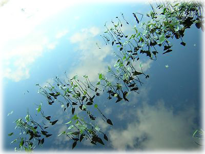 ![]() 湖面には鏡のように空が写っていました。野生の水草が生えたところに雲が映っているのはなんとも幻想的 |